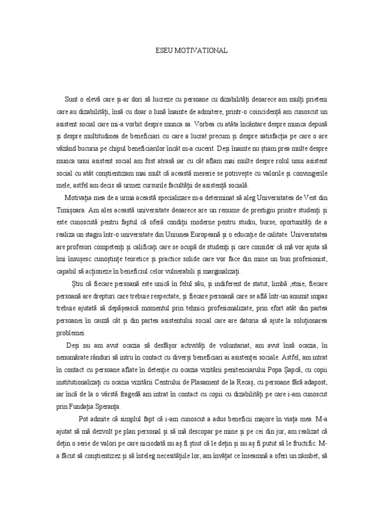 Eseu motivational mai jos o sa aveti mai multe scrisoare de motivatie model facultate. Documente necesare pentru înscrierea la nivel master: Dup finalizarea programului de studii universitare de master, v gndii s continuai pregtirea profesional prin nscriere la doctorat?